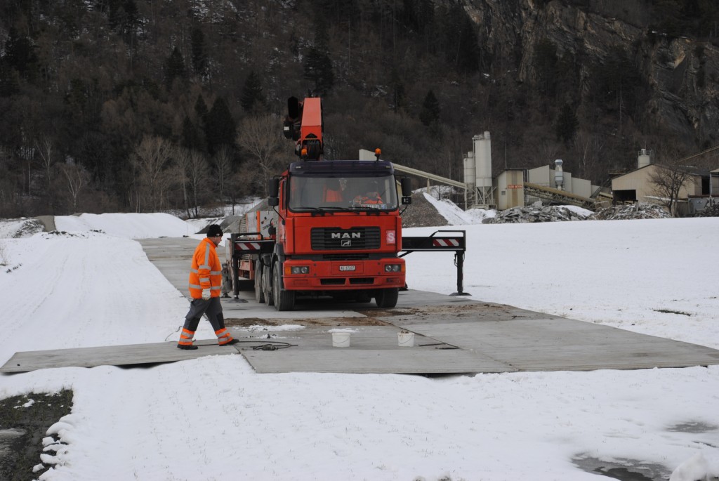 Bauarbeiten der mobilen Zufahrtspiste für die Transport-Fahrzeuge.